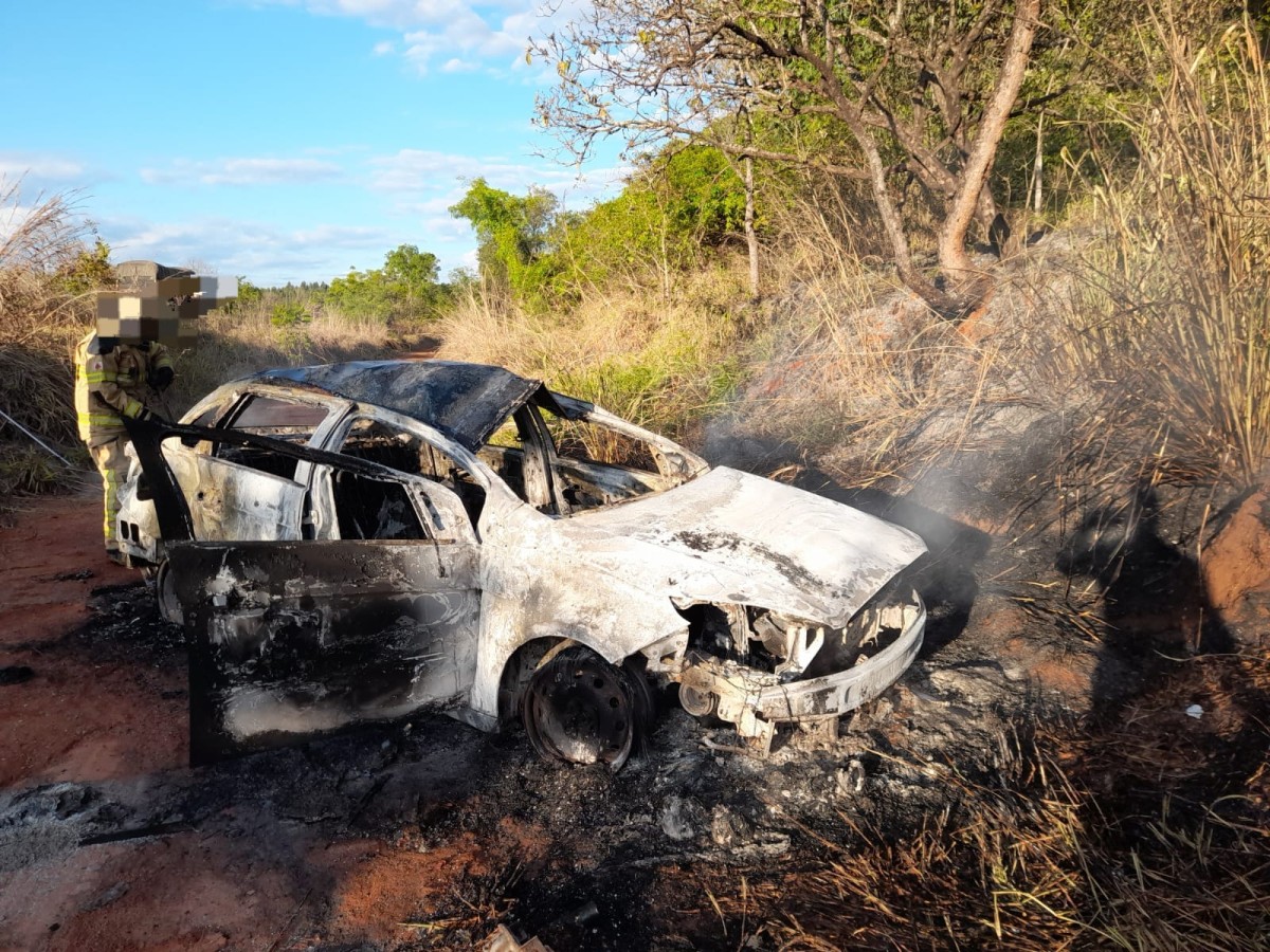Carro fica destruído após capotamento e incêndio na MG-170 em Lagoa da Prata