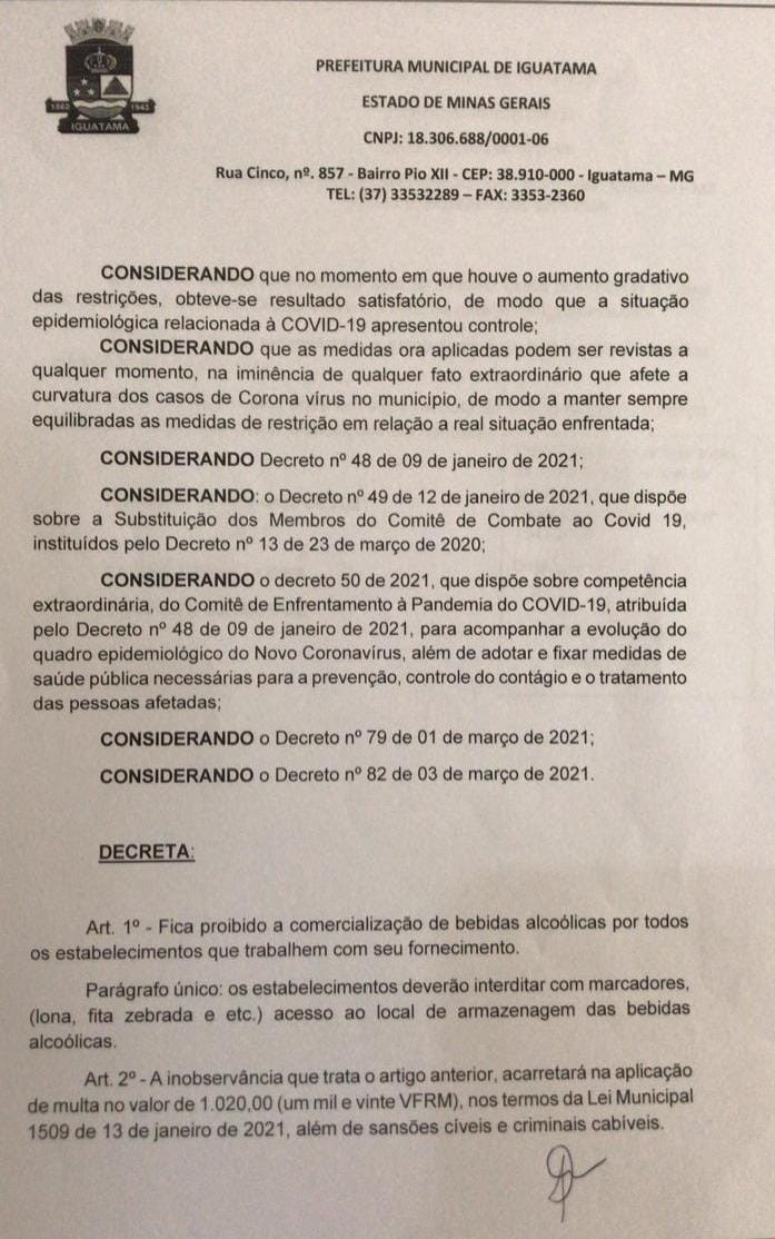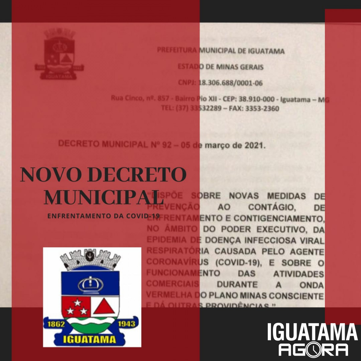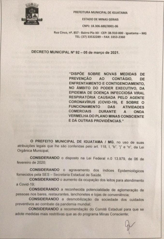 Prefeitura de Iguatama lança decreto municipal de nº 92, de 5 de março de 2021.