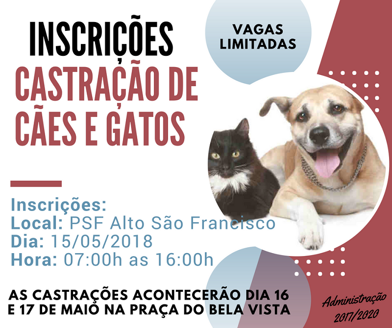Faça a inscrição para a castração de seu cão ou gato. As castrações acontecerão dia 16 e 17 de Maio na praça do Bairro Bela Vista.