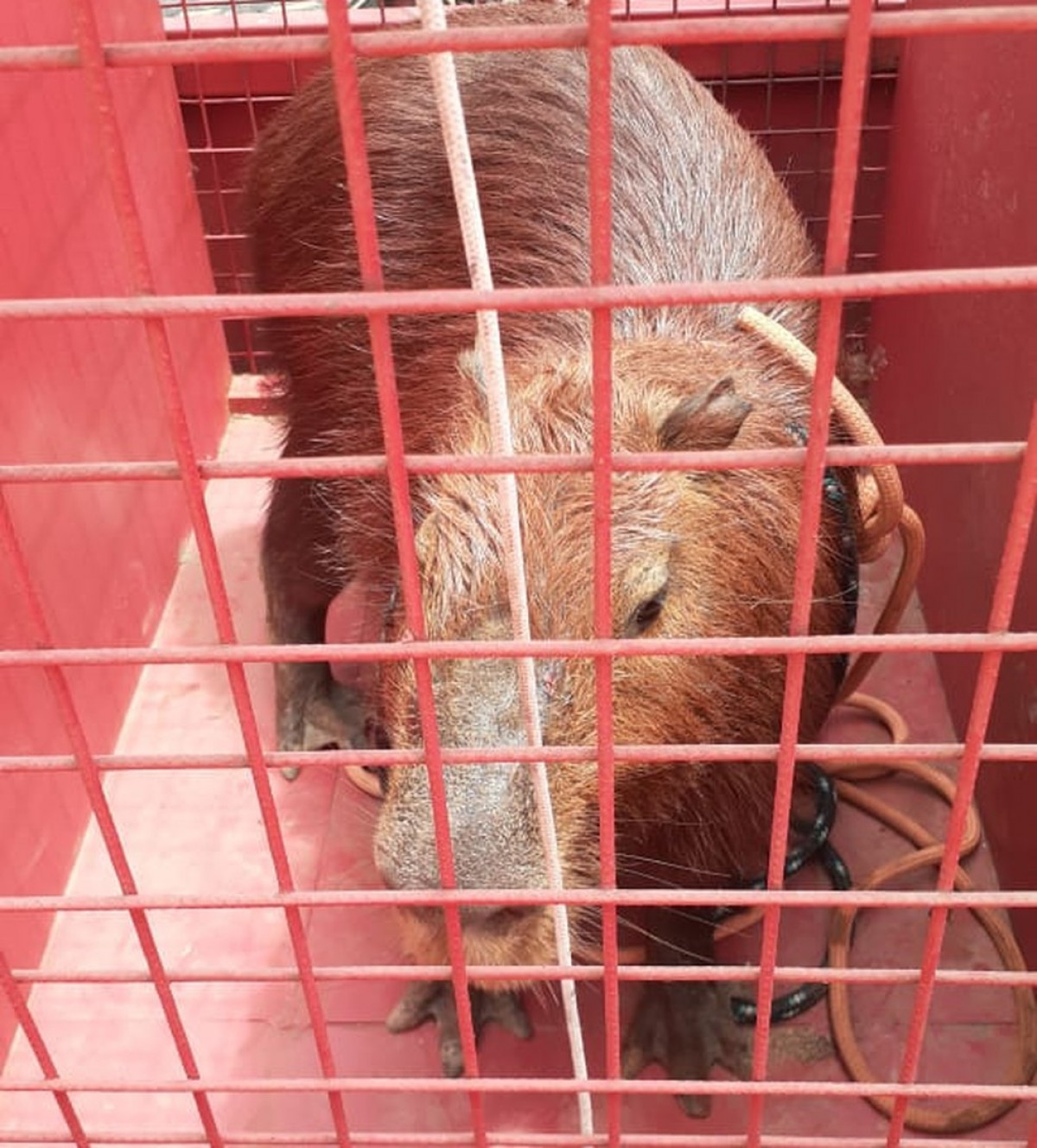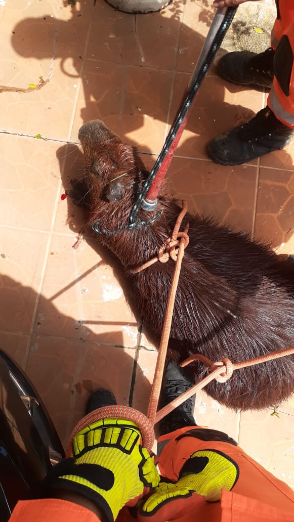 A guarnição encontrou a capivara adulta, pesando cerca de 60 kg, as margens da lagoa, próximo ao pontilhão, com ferimentos e uma fratura na pata direita.