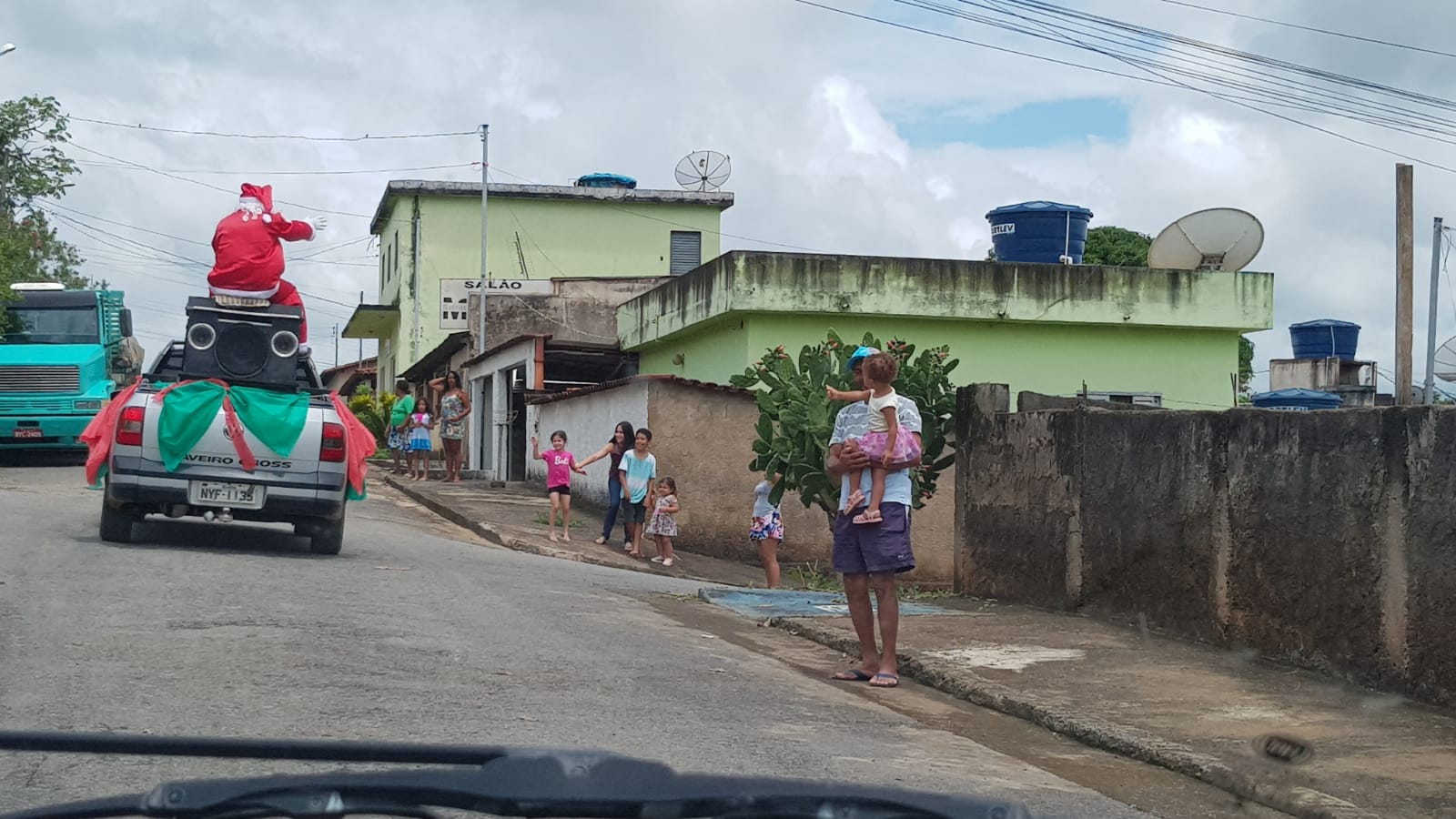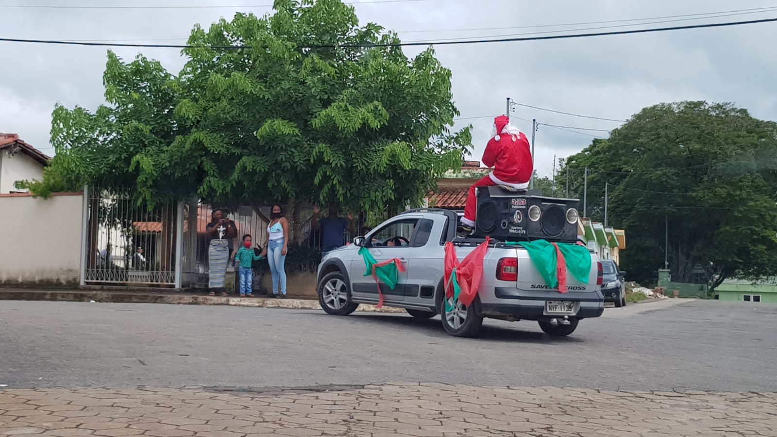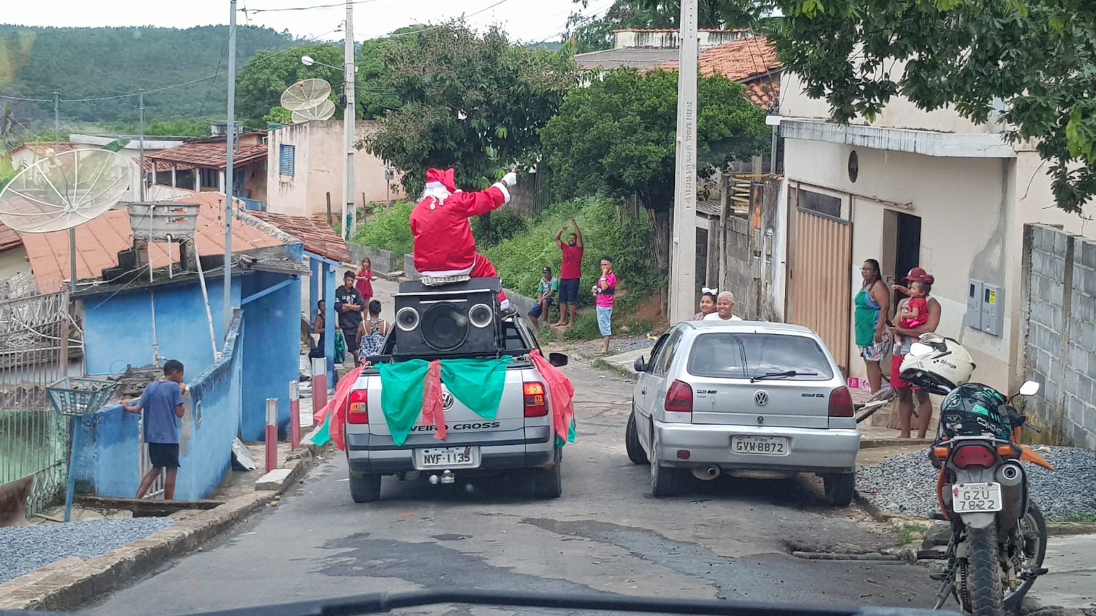O papai noel passa em um carro distribuindo guloseimas pelos bairros da cidade, trazendo magia e encanto aos olhos dos pequenos, que vibram de alegria em ver o papai noel.