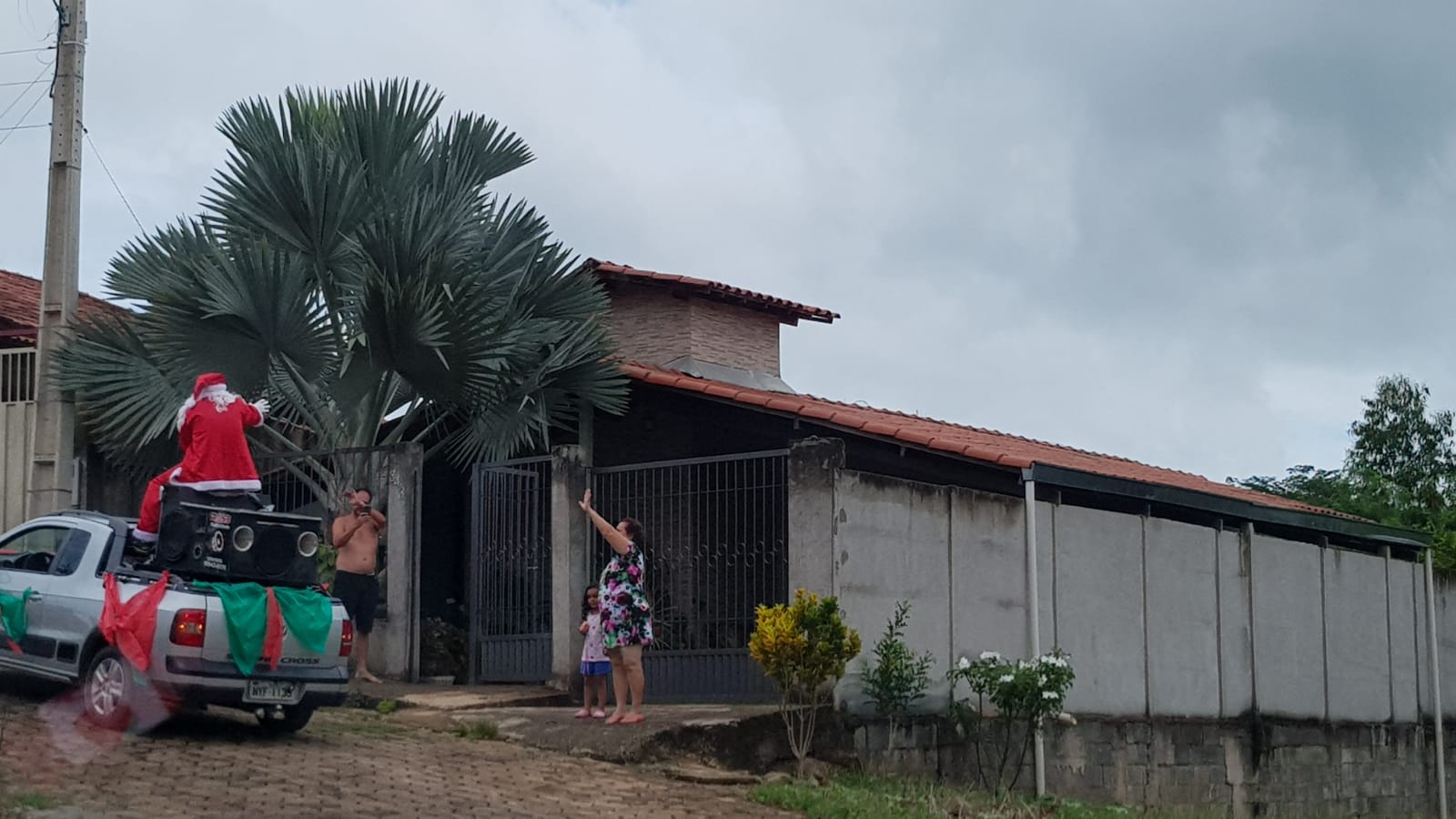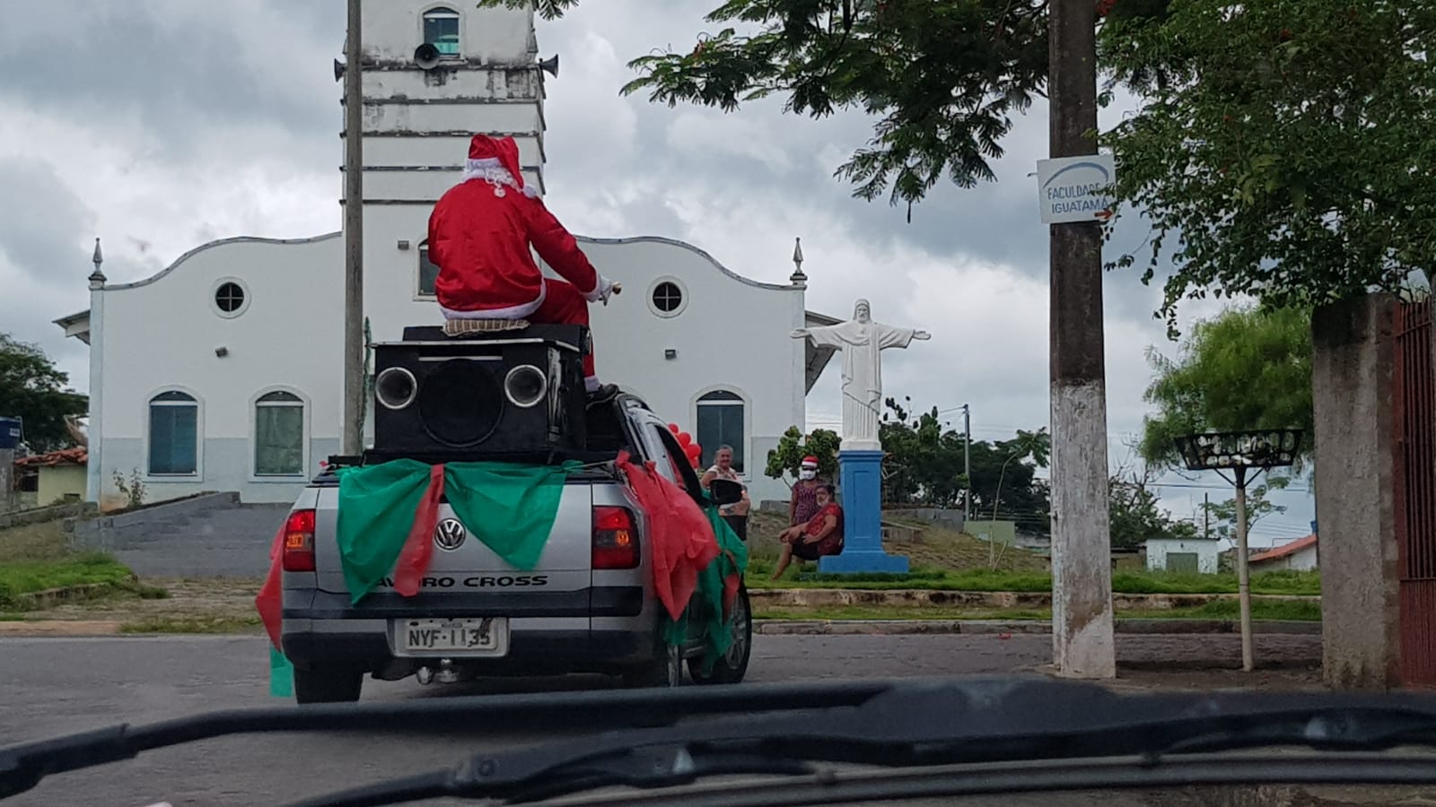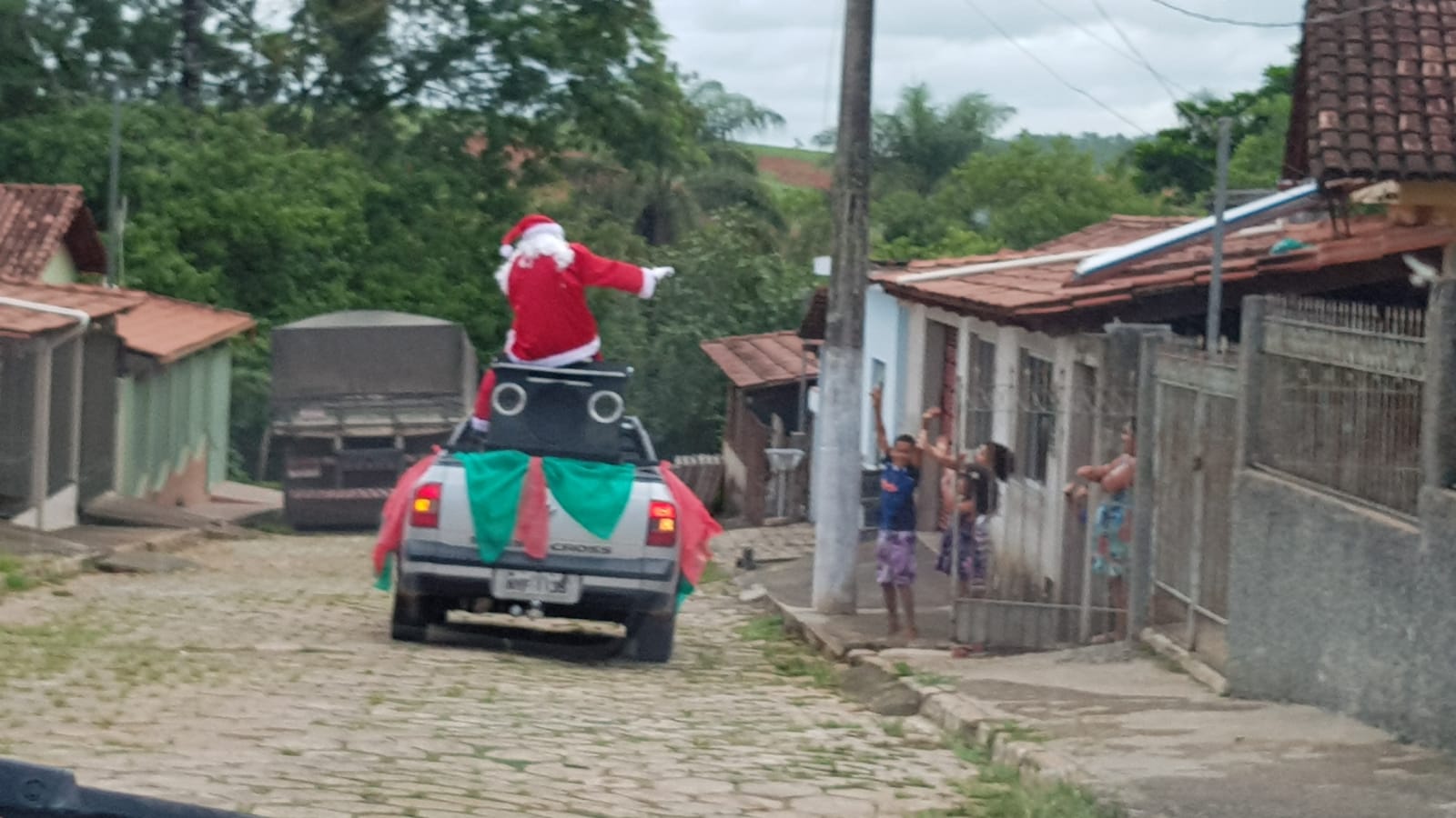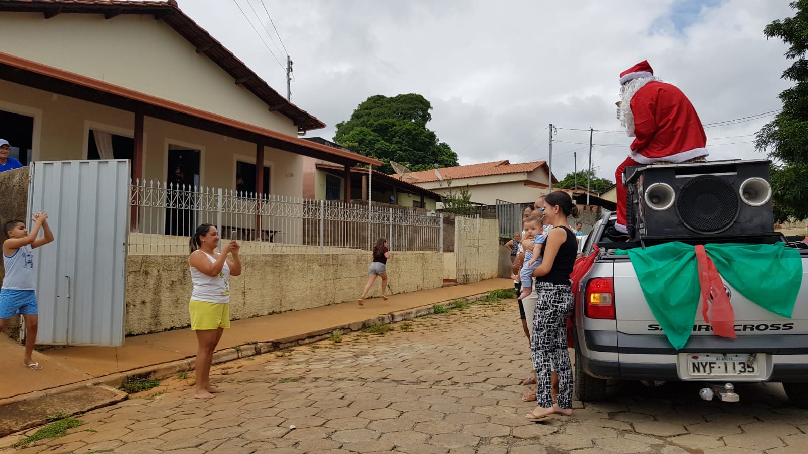 O papai noel passa em um carro distribuindo guloseimas pelos bairros da cidade, trazendo magia e encanto aos olhos dos pequenos, que vibram de alegria em ver o papai noel.