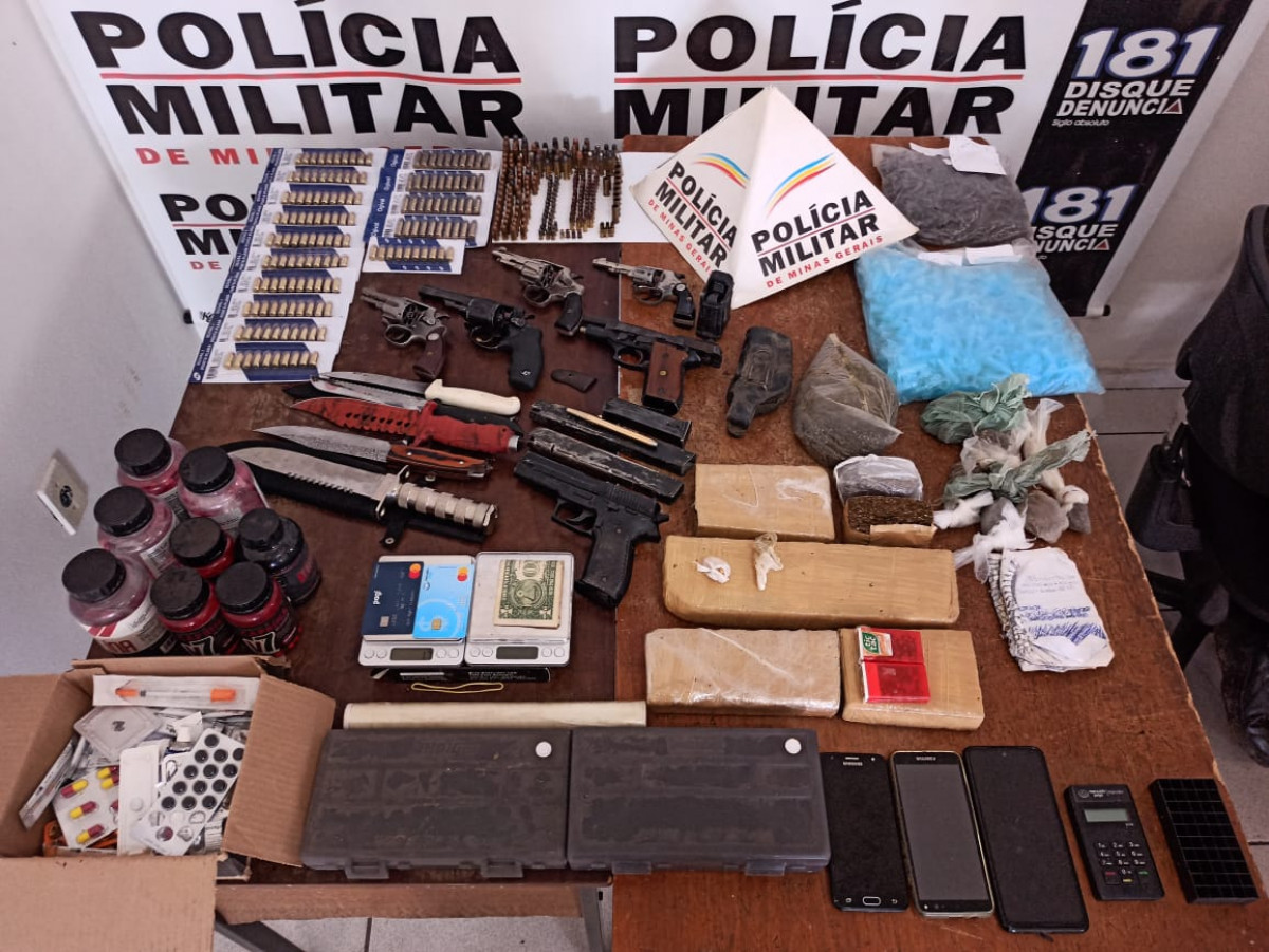 Ainda na segunda-feira pela manhã na cidade de Bambuí, em cumprimento ao mandado de busca e apreensão em duas residências situadas no bairro nações, policiais militares conseguiram aprender uma vasta quantidade de drogas munições armas de fogo e materiais ilícitos, o local é de difícil acesso, cercado com cerca, concertina e com várias câmeras de monitoramento na parte externa, além da presença de cães ferozes o que dificultou muito a ação da Polícia Militar. Um dos autores fugiu durante o cumprimento do mandado, mas foi capturado e preso algum tempo depois. Acompanhe a matéria completa: Clique Aqui