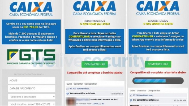 Após informar seus dados pessoais, a vítima é orientada a compartilhar o golpe com 5 amigos no mensageiro para poder acessar a lista de confirmação para receber o benefício e, para passar credibilidade ao golpe, os criminosos mostram falsos usuários e comentários no Facebook, como se o saque tivesse sido bem-sucedido.