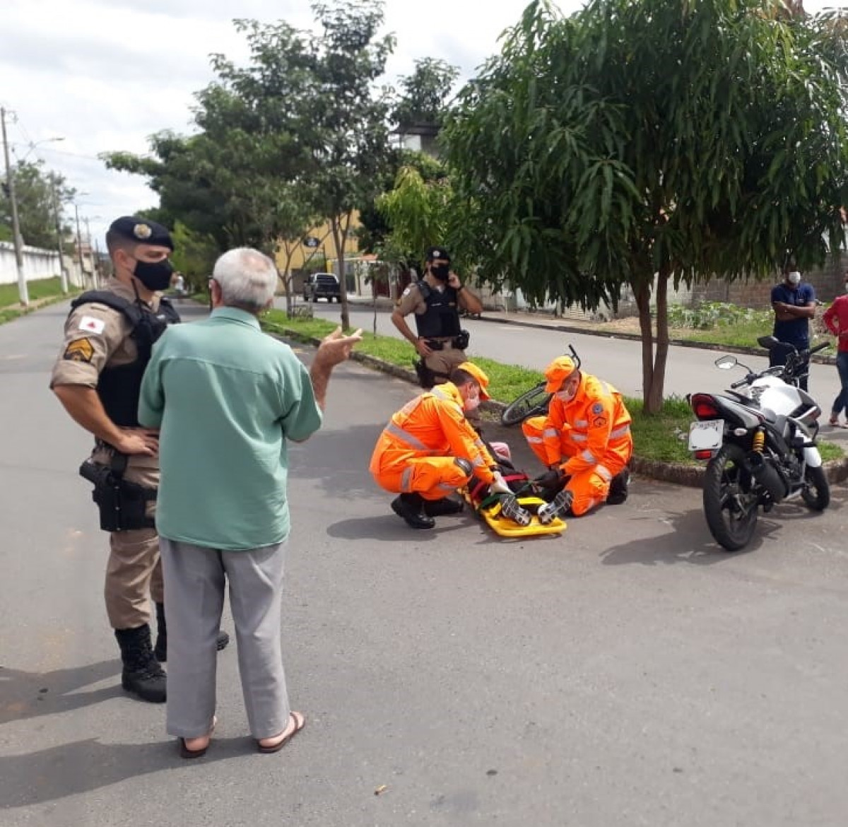 A condutora da motocicleta não apresentava ferimentos, porém, se queixava de dores na região dos membros inferiores. Já o ciclista apresentava escoriações pelo corpo e se queixava de dores na região das costelas. Ambas as vítimas estavam conscientes na chegada da guarnição.