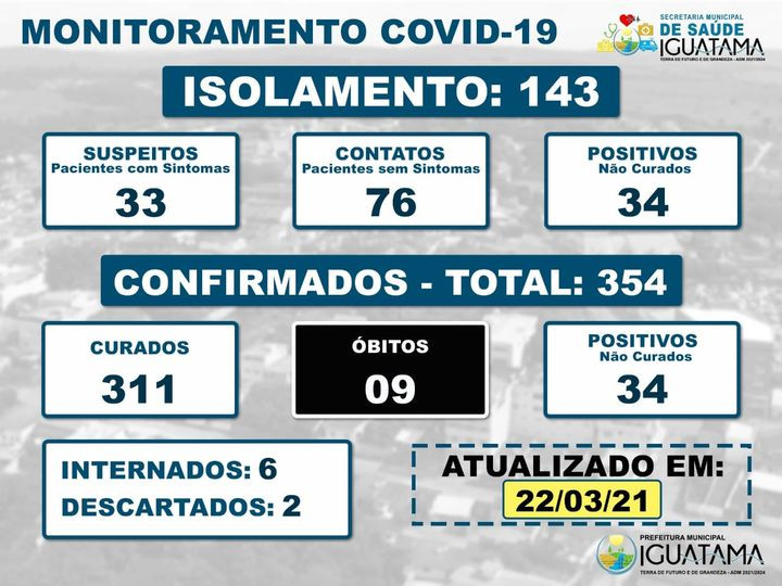 A Secretaria Municipal de Saúde de Iguatama, apresentou um novo boletim epidemiológico referente aos dias 20 e 21 de março, apresentando 4 novos casos positivos da Covid-19. Totalizando 354 casos confirmados da doença; 34 pessoas encontram-se em quarentena com o vírus ainda ativo e 6 pessoas estão internadas por complicações da doença.