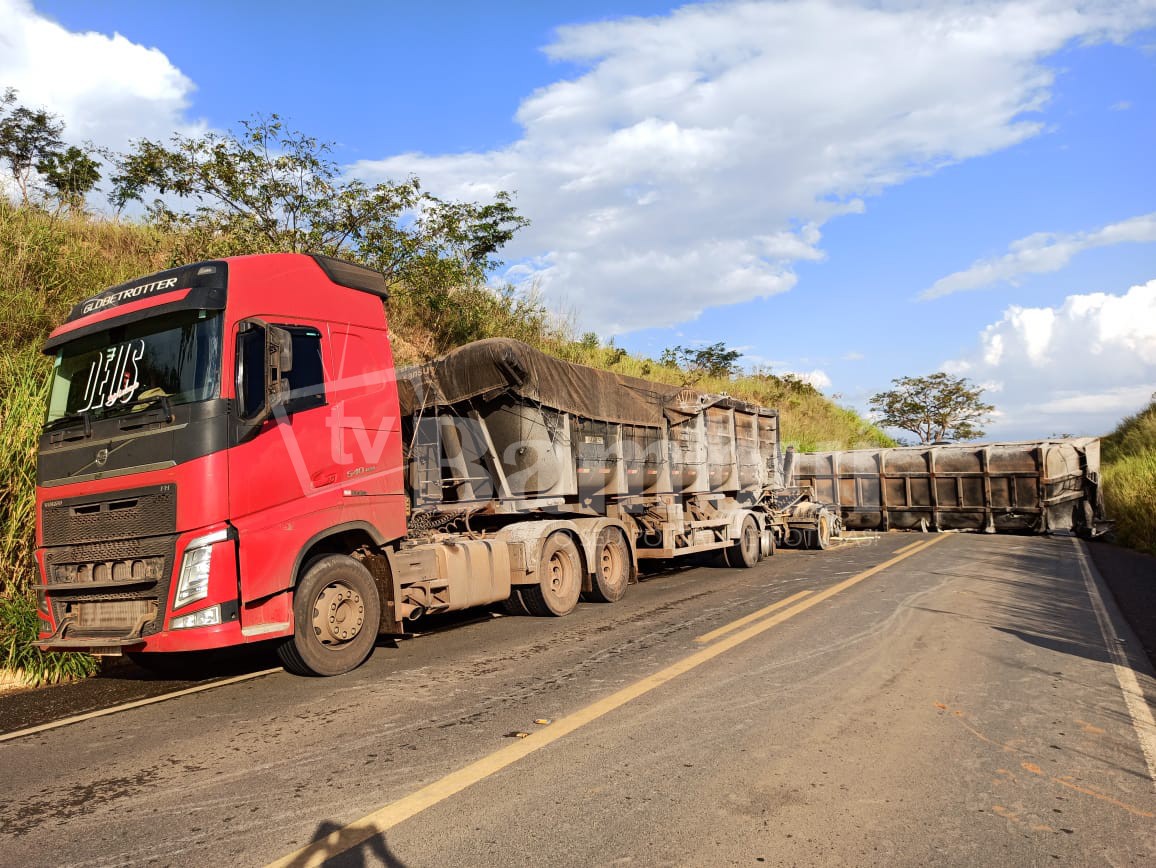 o condutor da carreta Volvo FH540, com placas de São José dos Pinhais/PR, carregada com calcário, seguia no sentido Bambuí para Tapiraí quando em determinado momento o último vagão tombou e atingiu a carreta Scania R440, com placas de Itumbiara/GO, que vinha no sentido contrário e estava carregada com farelo de soja.