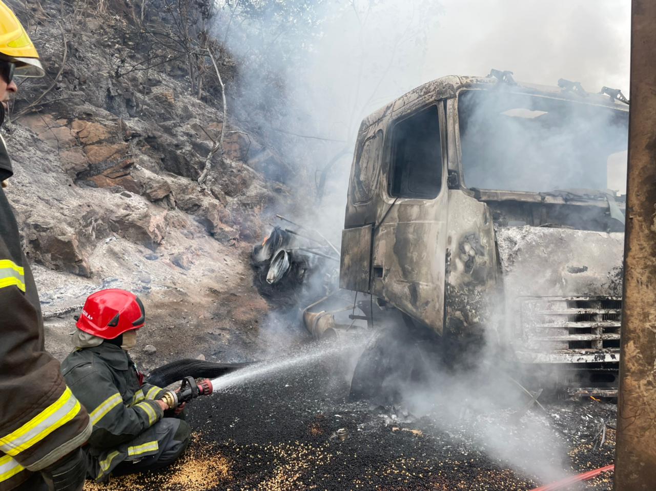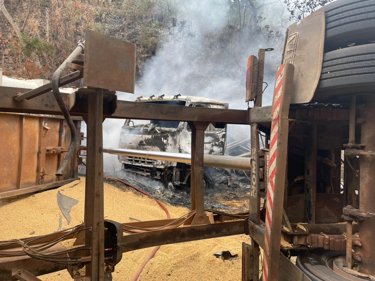 Na manhã deste sábado por volta das 11h, o Corpo de Bombeiros Militar em Formiga foi acionado pelo telefone 193 para combater um incêndio em uma carreta bitrem carregada de soja, que tombou na rodovia BR-354 na altura do km- 520.