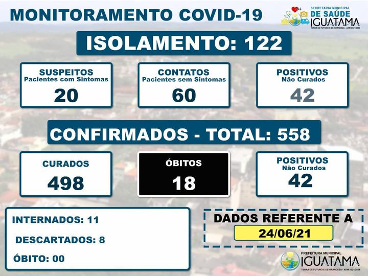 Boletim de Iguatama referente aos dias 23 e 24 de junho, apresenta 8 novos casos da Covid-19. 42 pessoas encontram-se em quarentena com o vírus ativo e 11 pessoas estão internadas por complicações da doença.