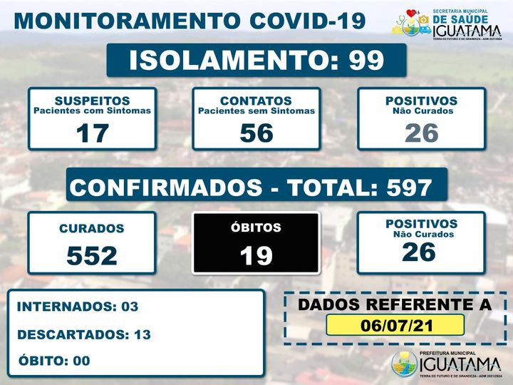 Boletim de Iguatama referente ao dia (6/07), apresenta 4 novos casos positivos da Covid-19 . Vinte e seis pessoas encontram-se em quarentena com o vírus ativo e três pessoas estão internadas por complicações da doença.