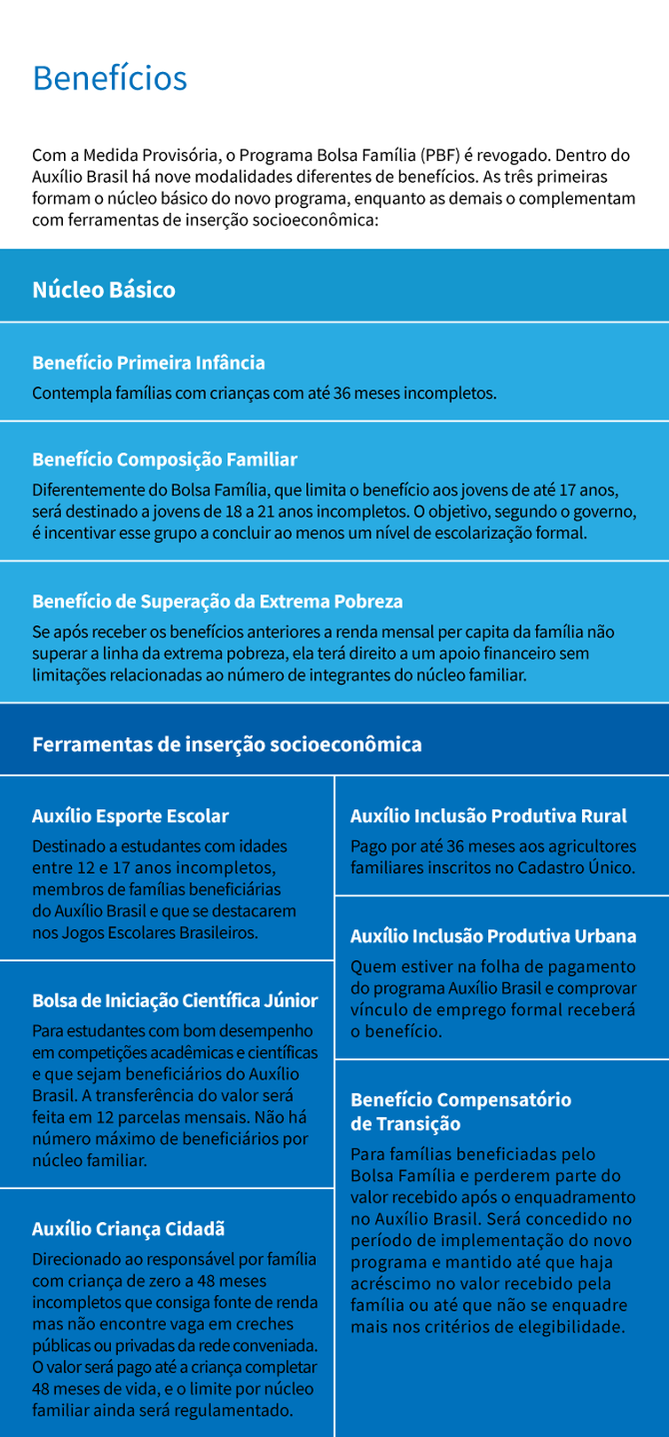 Chamado de Auxílio Brasil, o novo programa social que pretende substituir o Bolsa Família tem três modalidades de benefício básico: para primeira infância, para famílias com jovens de até 21 anos de idade e para a complementação para famílias que não conseguirem sair da extrema pobreza mesmo após receber os benefícios anteriores. Os valores só serão definidos no fim de setembro.