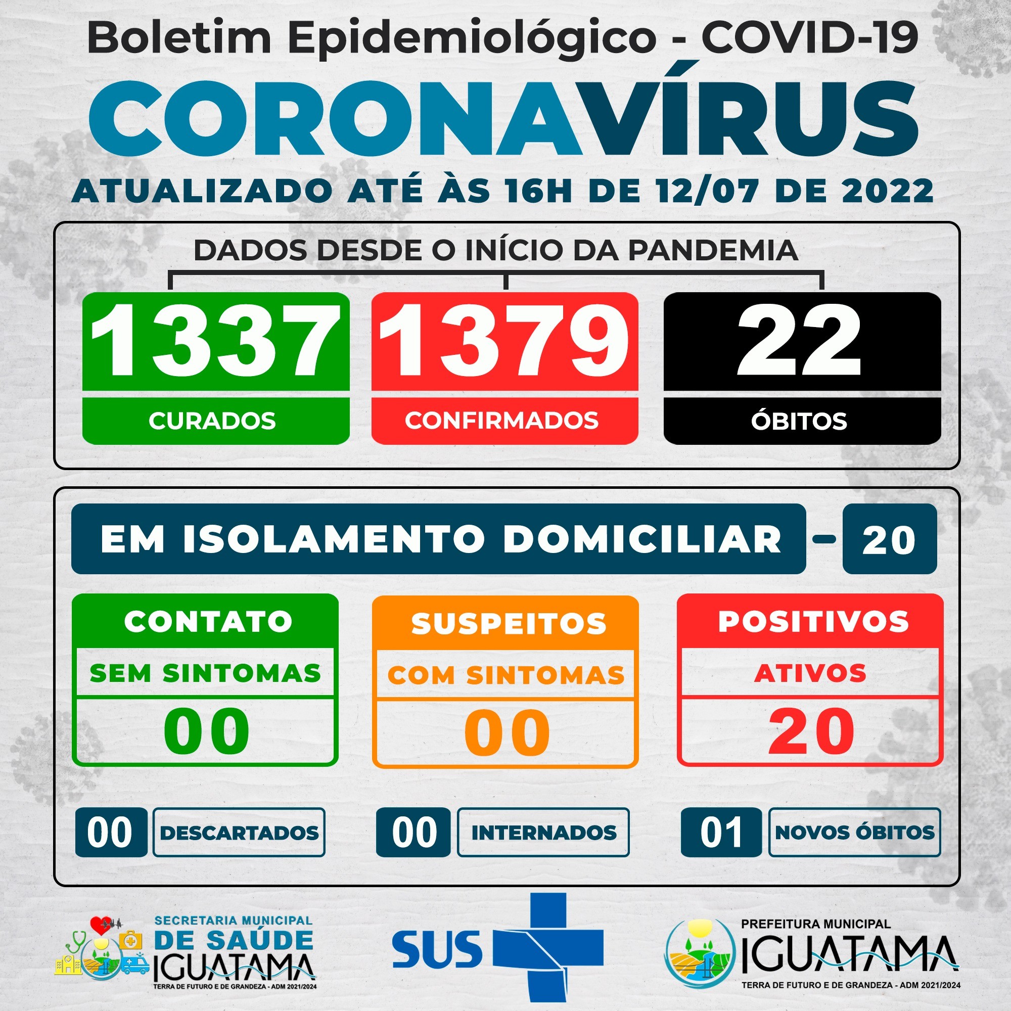 Boletim epidemiológico de Iguatama apresenta um novo óbito por covid-19 no município. Trata-se de um homem de 65 anos, que residia no bairro Garças de Minas.