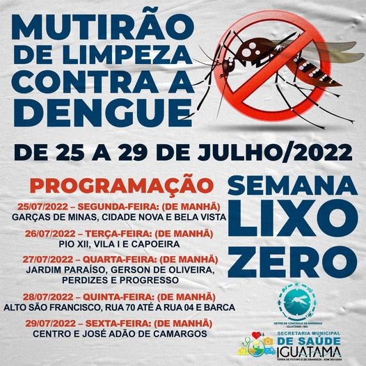 Na próxima semana de 25 a 29 de julho, acontecerá a Semana Lixo Zero - Mutirão de limpeza contra a dengue.