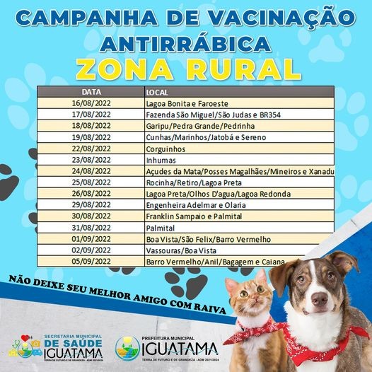 A Campanha de vacinação contra a raiva em Iguatama já foi iniciada, e os animais da zona rural estarão sendo imunizados à partir de hoje terça-feira (16).