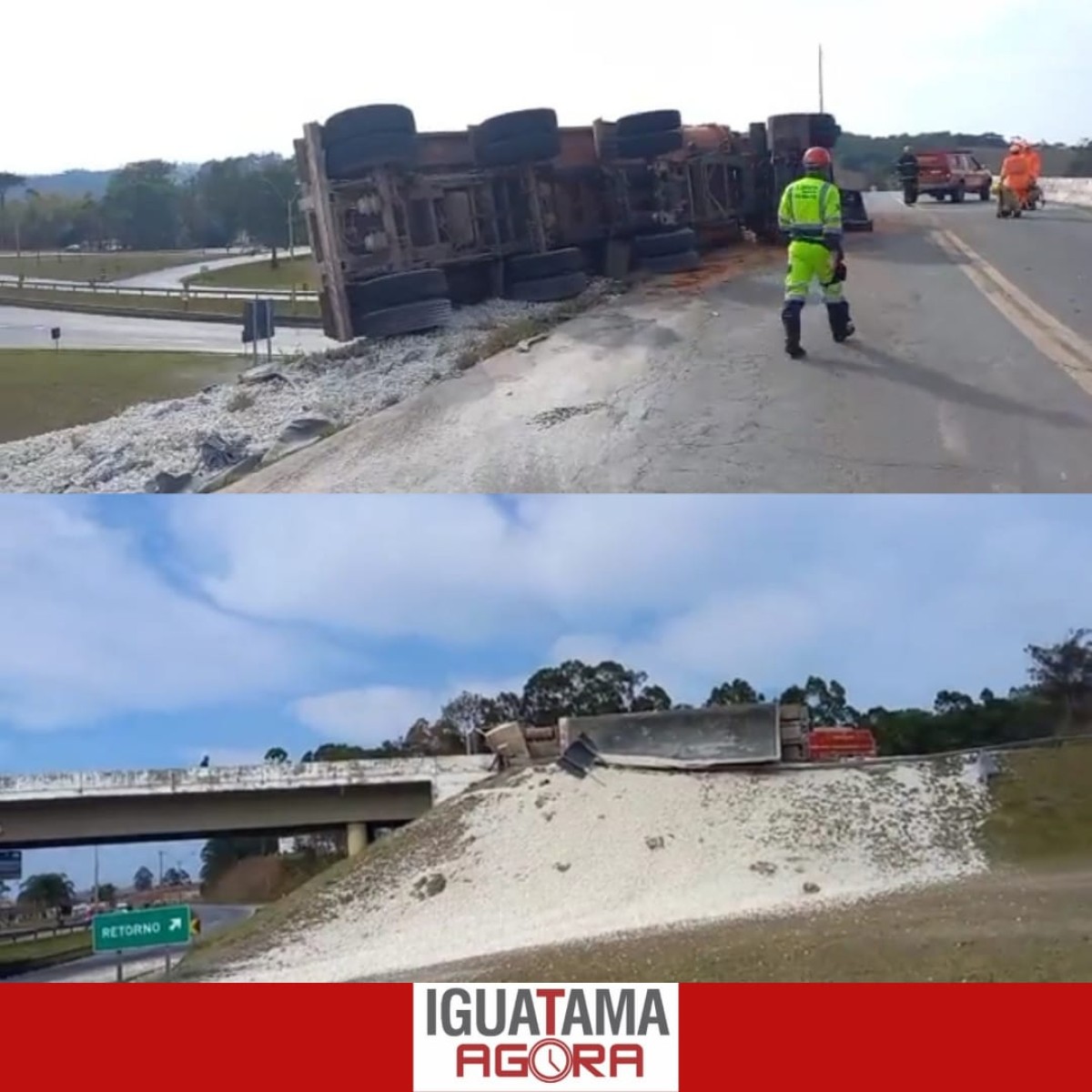 Um grave acidente na BR-381, ocorreu na manhã desta segunda-feira (26), o motorista não resistiu ao impacto do acidente vindo a óbito. A carreta de Formiga/MG carregada com cal virgem tombou na ponte do trevo próximo ao Posto Juá, em Oliveira.