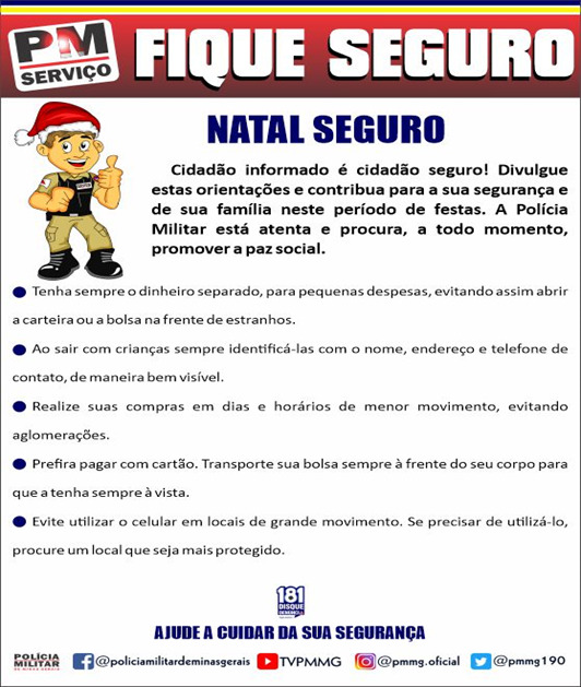 Diante desta perspectiva, para inibir a prática de crimes e aumentar a sensação de segurança nos 853 municípios de Minas, a Polícia Militar desenvolve a ‘Operação Natalina’, objetivando minimizar as chances de sucesso dos criminosos e melhorar ainda mais os índices de segurança em todas as regiões do estado. A estratégia da ação é planejada para as regiões com maior movimentação de pessoas e fluxo de dinheiro, como a área central da cidade e bairros adjacentes, nos quais estão localizados o maior número de lojas, bancos e shoppings. Trata-se de uma operação de foco preventivo e de repressão qualificada de delitos in loco.