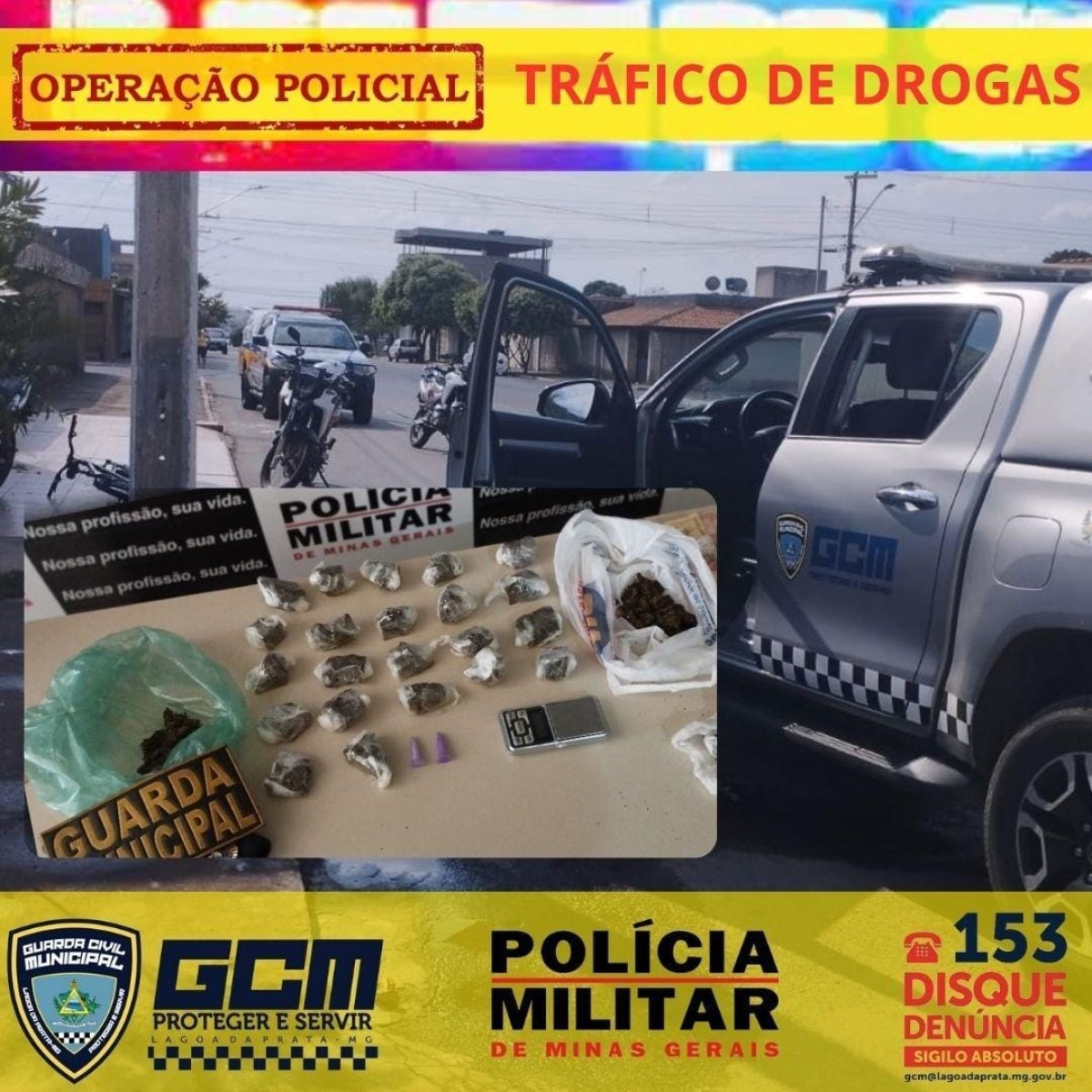 A central de atendimento 153 da Guarda Civil Municipal de Lagoa da Prata recebeu denúncia anônima relatando que estaria ocorrendo intenso tráfico de drogas em uma determinada localidade do bairro Marília.