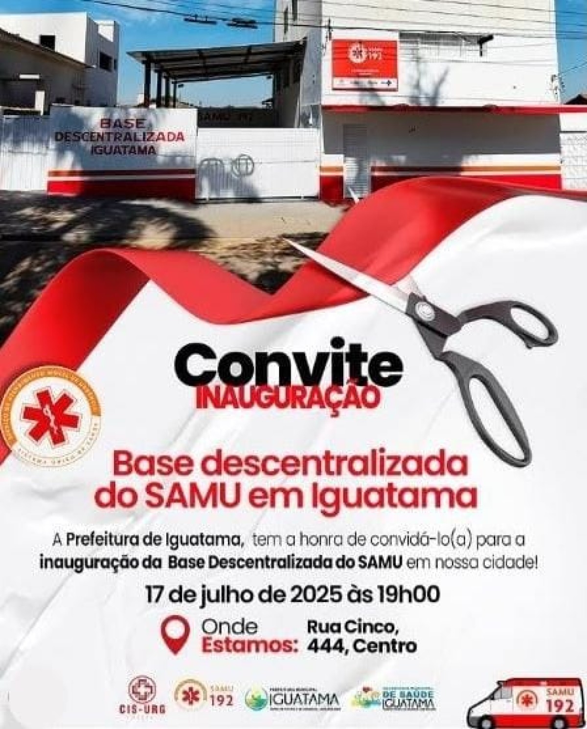 A Prefeitura de Iguatama convida à todos para a inauguração da Base Descentralizada do SAMU, um importante avanço no atendimento de urgência e emergência no município.