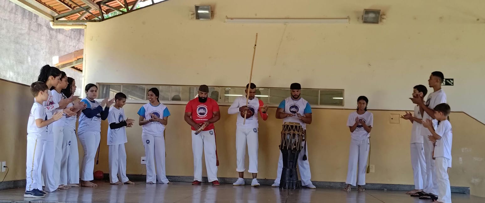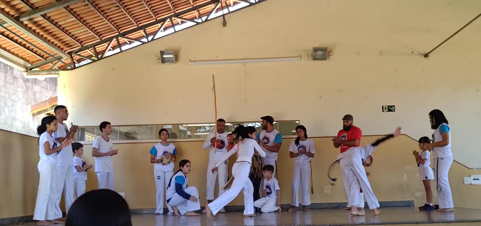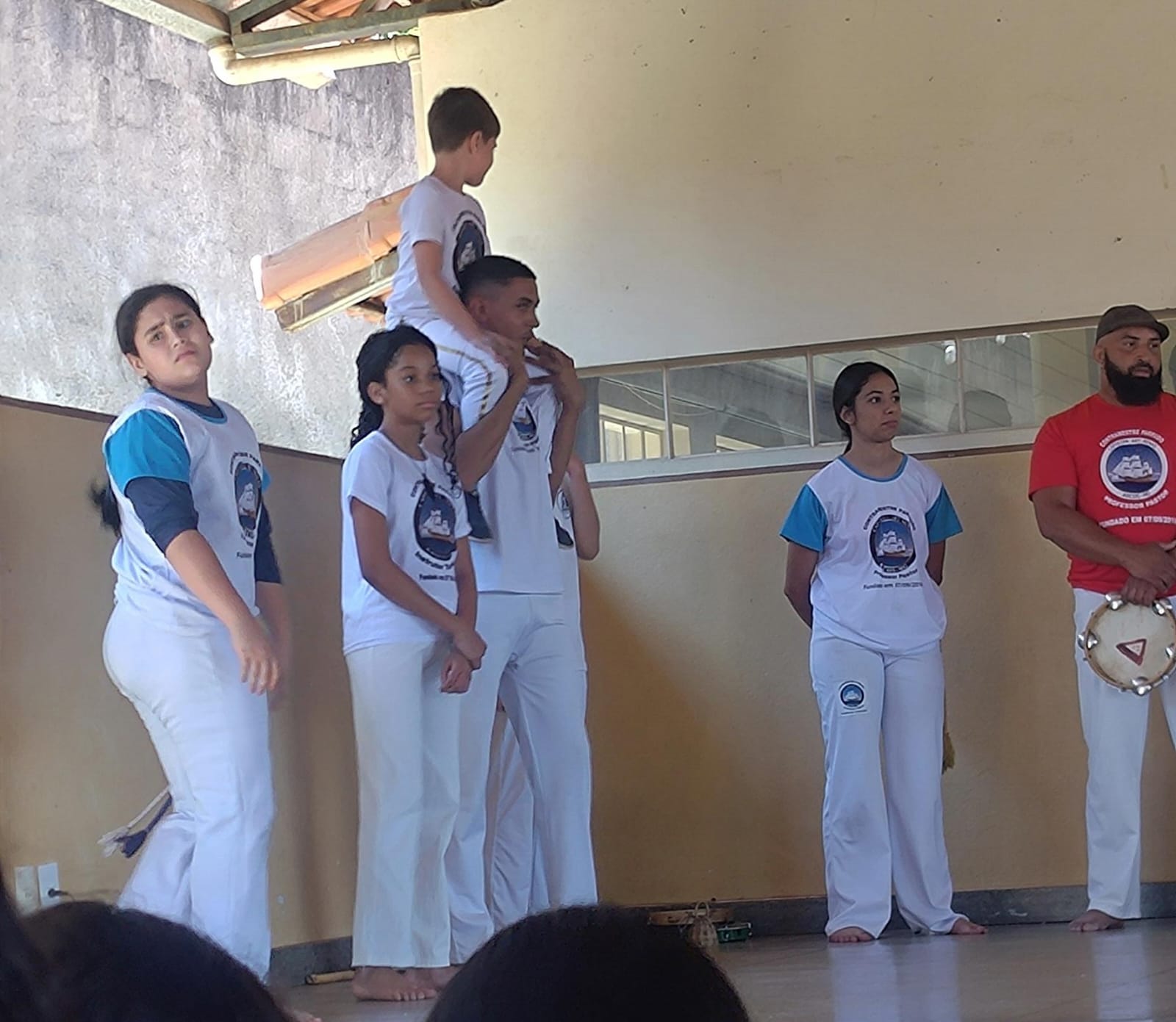 O Grupo de Capoeira Art Minas fez uma belíssima apresentação, com a orientação do professor Max (Tornado), acompanhado do Contra Mestre e fundador do Grupo Art Minas, Aleandro (Parrudo) e do professor de capoeira da cidade de Arcos, (Pastor). As crianças e os jovens capoeiristas mostraram ritmo, dança, luta e magia no palco da escola.