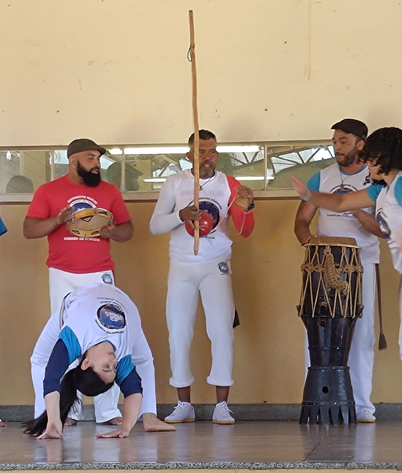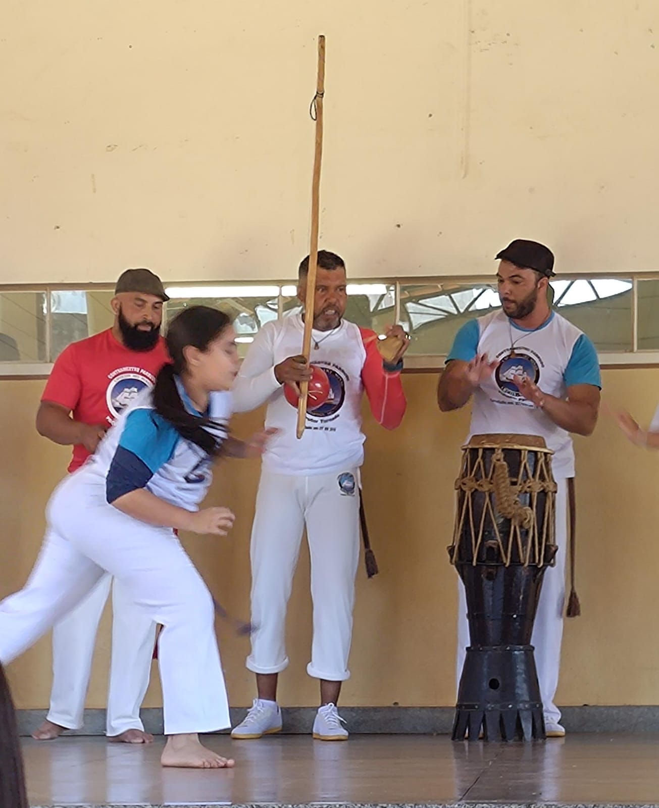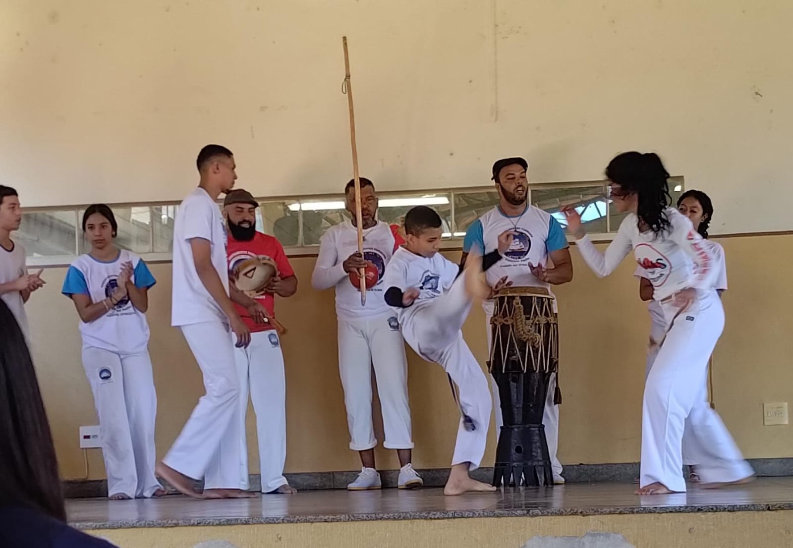 O Grupo de Capoeira Art Minas fez uma belíssima apresentação, com a orientação do professor Max (Tornado), acompanhado do Contra Mestre e fundador do Grupo Art Minas, Aleandro (Parrudo) e do professor de capoeira da cidade de Arcos, (Pastor). As crianças e os jovens capoeiristas mostraram ritmo, dança, luta e magia no palco da escola.