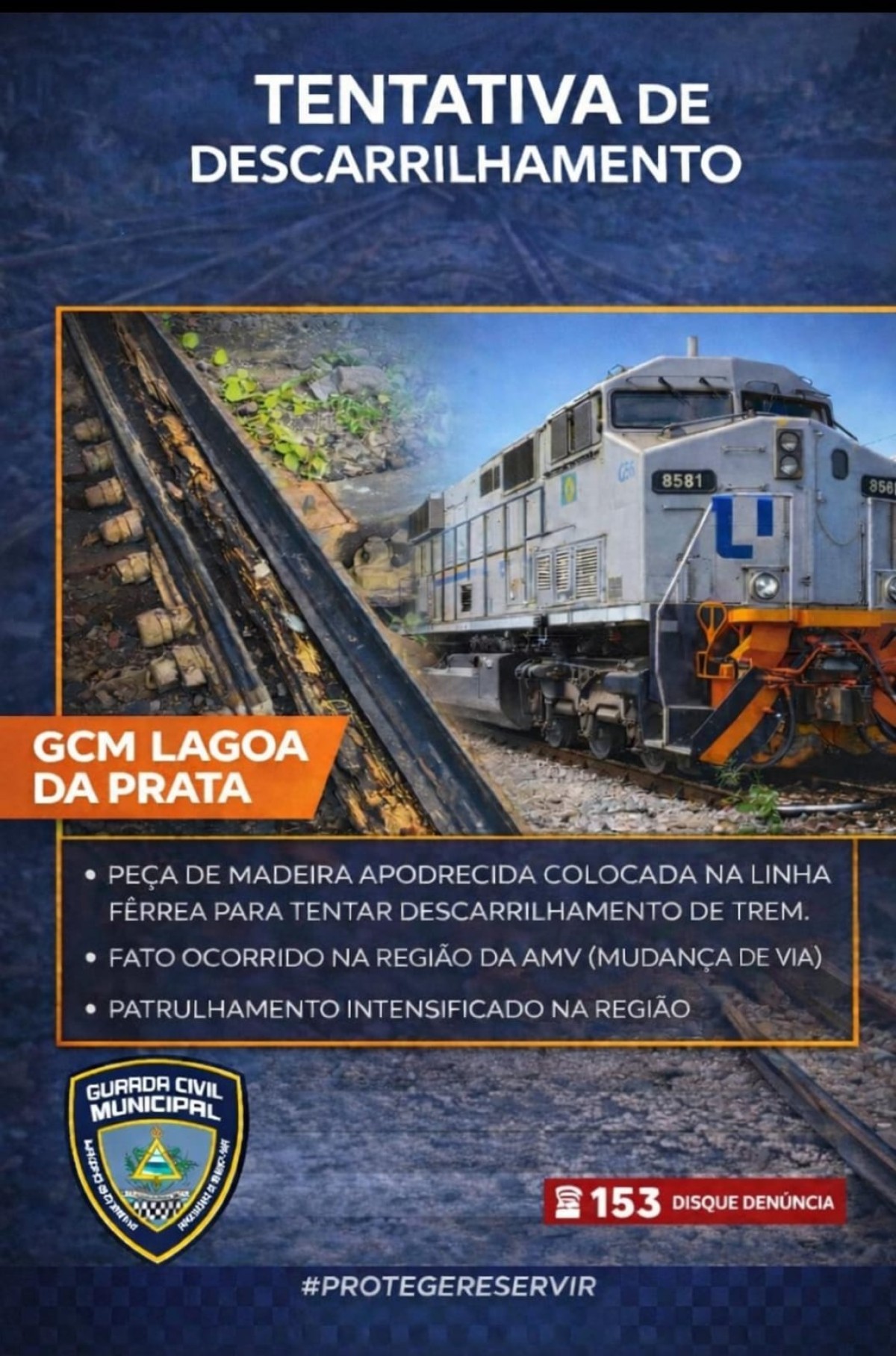 No início da semana foi relatado que indivíduo(s) não identificado(s) colocaram uma peça de madeira sobre a via férrea, na região do aparelho de mudança de via (AMV), possivelmente com o intuito de provocar o descarrilamento de uma composição ferroviária em Lagoa da Prata. Contudo, a madeira encontrava-se deteriorada, não ocorrendo o descarrilamento, sendo constatados apenas danos leves na via permanente, sem vítimas e sem lesões ao maquinista.
