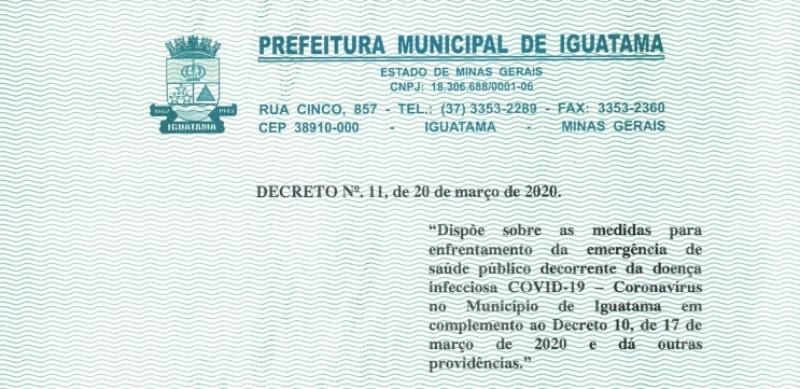 A Prefeitura Municipal de Iguatama também acaba de decretar medidas de enfrentamento contra a COVID-19 no município, o decreto é valido até o dia 31 de março, podendo ser renovado caso seja necessário.