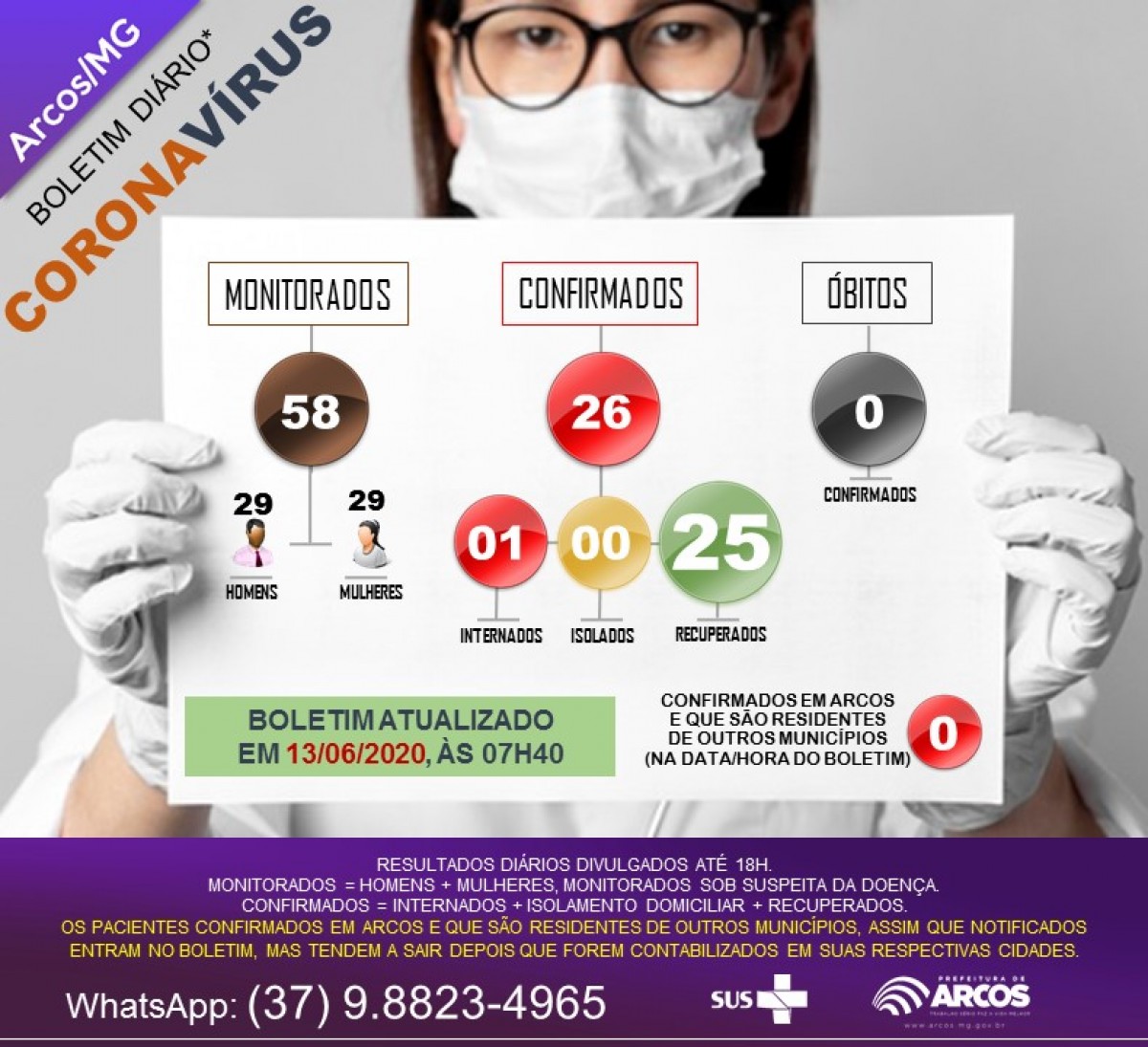 A Secretaria Municipal de Saúde de Arcos divulgou mais um Boletim Coronavírus, atualizando os dados da doença na cidade.