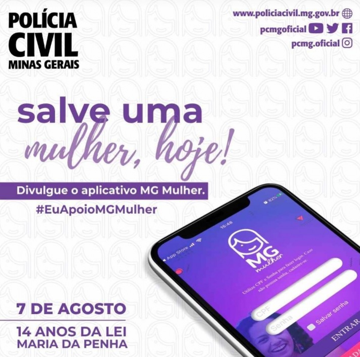 Para celebrar os 14 anos da Lei Maria da Penha, a Polícia Civil de Minas Gerais convida a todos que divulgue o aplicativo MG Mulher.