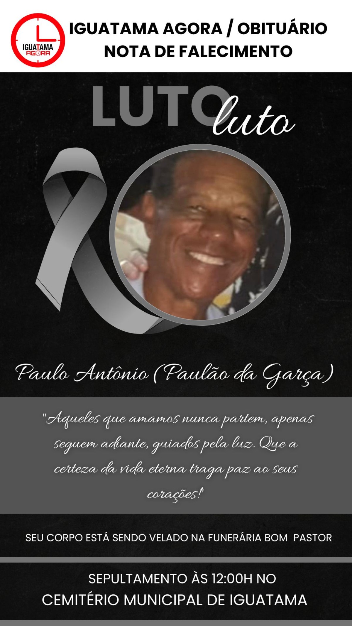 A Funerária Bom Pastor se despede hoje da Senhora Lucilda, irmãos: Lula, Luci, Ana, Francisca, Antônio, Zé Baixinho (em memória) e Chico convidam para sua despedida que está acontecendo na funerária Bom Pastor. Saindo em cortejo às 15:00horas para o sepultamento no Cemitério Municipal de Iguatama.