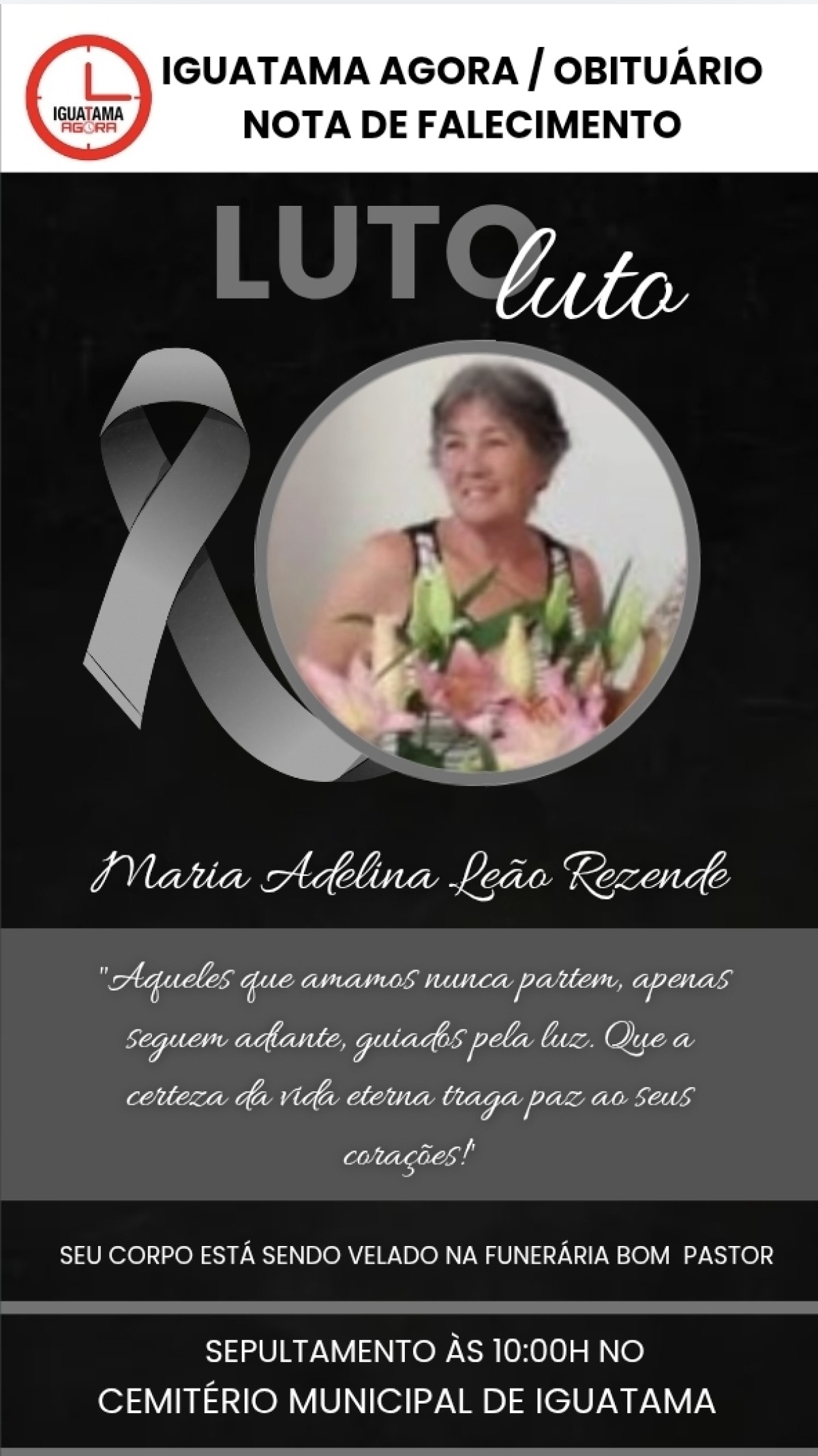A Funerária Bom Pastor se despede hoje da Sra.Maria Adelina, esposo: Arnaldo Leão Rezende, filhos: Yanko Leão Rezende, Amanda Leão Rezende e Diego Leão Rezende