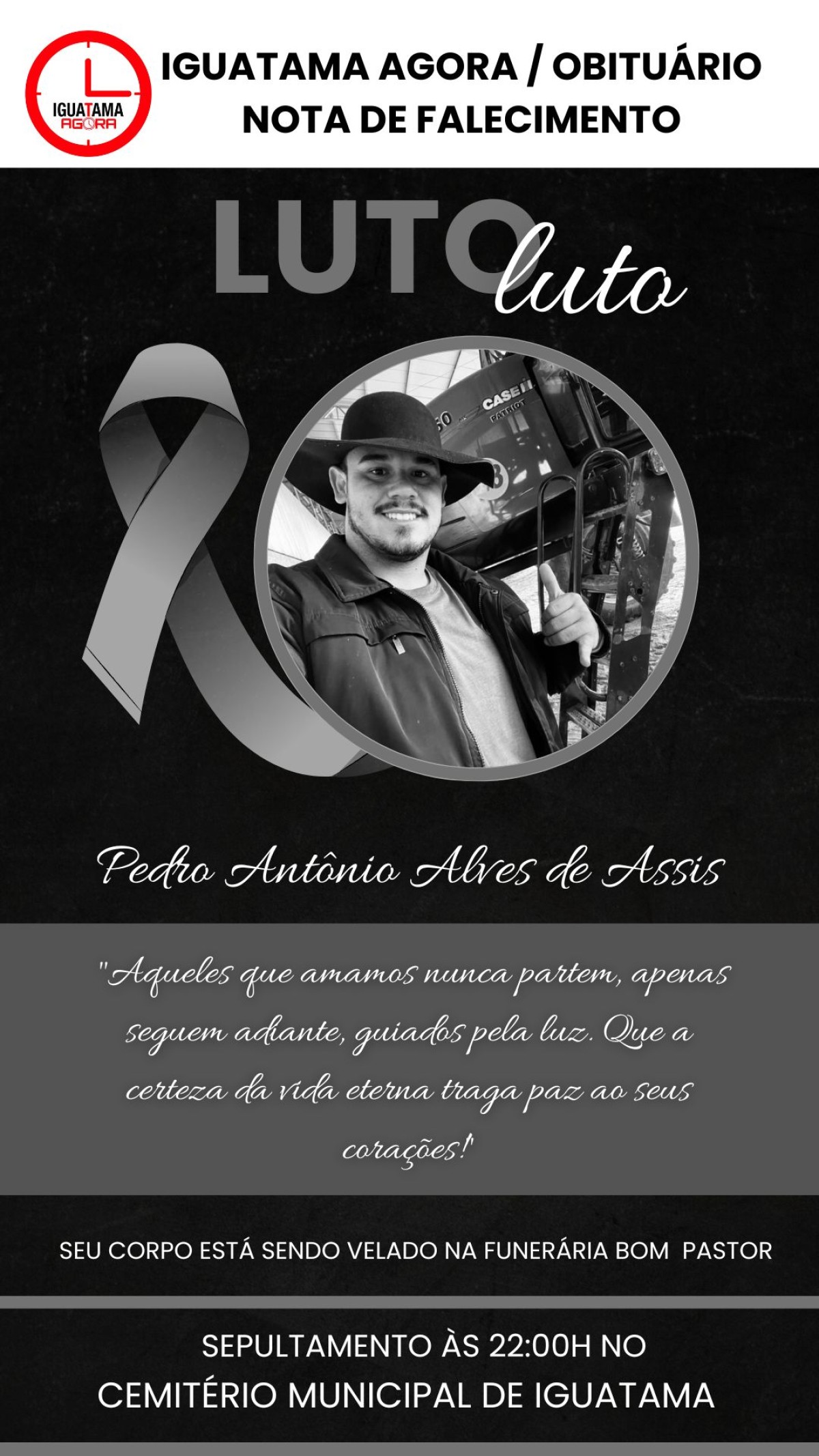 Saindo em cortejo às 22:00 horas para sepultamento no Cemitério Municipal de Iguatama.